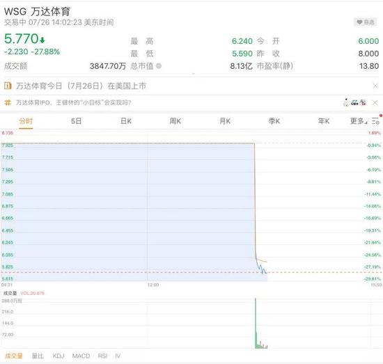 截至发稿,万达体育暴跌超27%,报5.77美元,市值仅剩逾8.1亿美元。