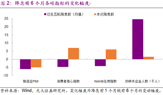 例如,前五轮降息前6个月密歇根大学消费者信心指数平均下降4.6,而这次降息前上升7;前五轮降息前住宅建筑商协会(NAHB)住房指数平均下降4.2,这次上升6;前五轮降息前 初次申请失业金人数月均增加2.5万,这次仅增加1500人(图2)。劳动力市场表现出色。