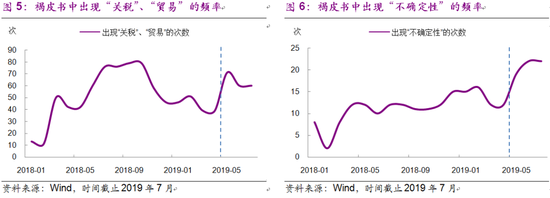 自2018年1月以来,褐皮书中出现“关税”、“贸易”、“不确定性”等词的次数明显增加。其中,“不确定性”一词出现的次数在今年7月的褐皮书中达到22次,为近两年来最多(图5-6),表明全球经济疲弱和关税政策给美国企业带来的影响仍在扩散,这也是引发美联储降息的重要原因。