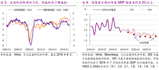 我们分别用一系列软、硬数据构造了两个跟踪美国经济景气度的指标[3],结果显示年初以来美国经济呈下行趋势,其中硬数据表现相对较弱,但软数据仍处在高位(图3)。我们基于这两个指数构建的模型显示,下半年美国经济增速将继续放缓,但四季度GDP同比增速或仍将达到2%以上(图4)。