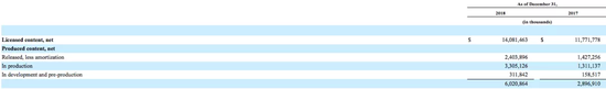 上图为奈飞的版权构成情况,截至2018年末共有200亿美金,其中第三方版权购买占了7成,虽然制作出《纸牌屋》等一线火爆视频,但截至目前自制剧占奈飞比重仍不算太大。