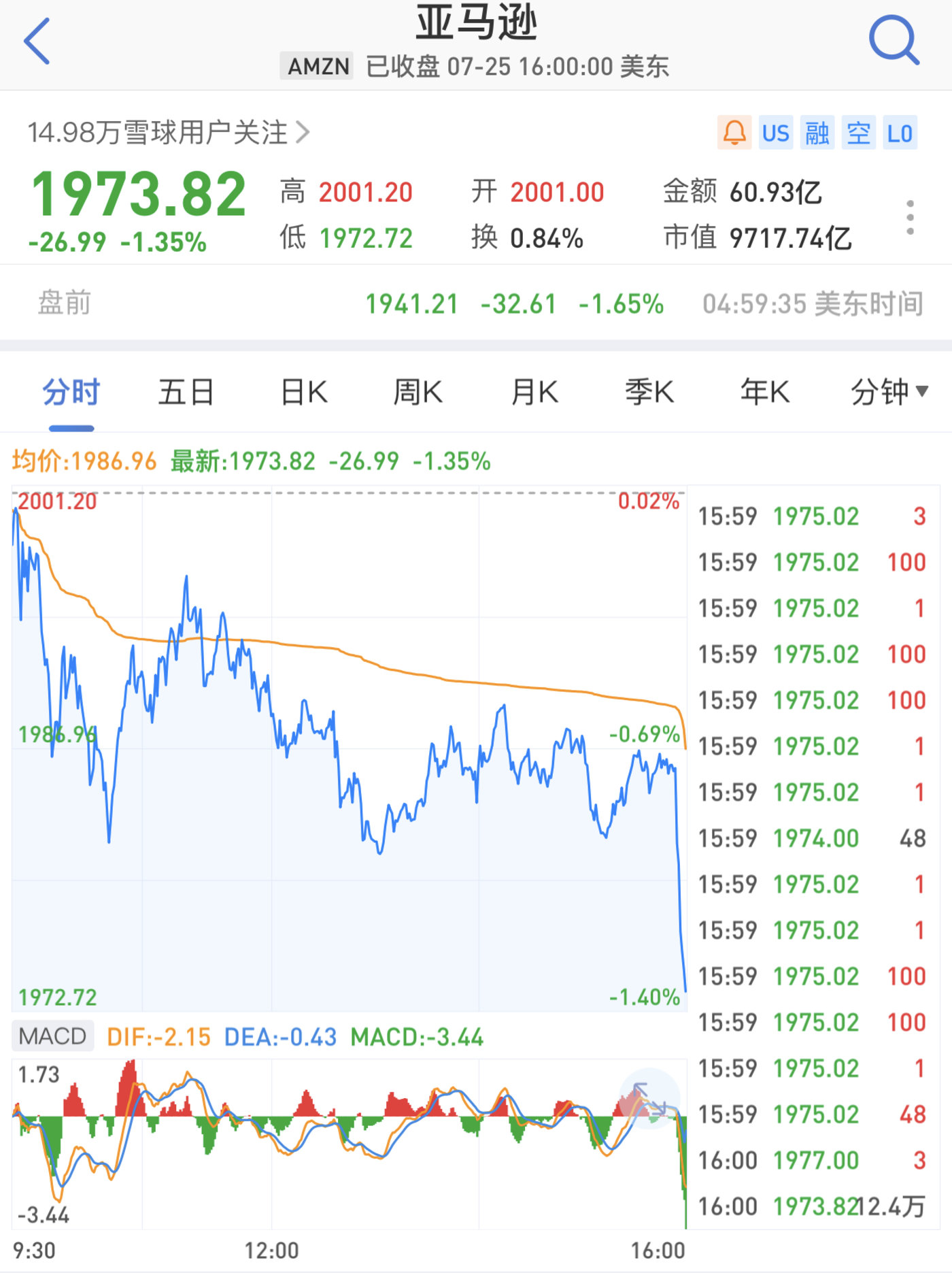 利润增长乏力也影响到了亚马逊的股价,美东时间7月25日收盘后,亚马逊在纳斯达克证券市场常规交易中下跌26.99美元,跌幅为1.35%,报收于1973.82美元,按照周四的收盘价计算,亚马逊市值约为9717.74亿美元。