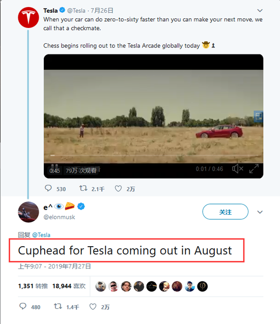 在昨天宣布国际象棋登陆Tesla Arcade之后,伊隆·马斯克在后续推文中宣布《茶杯头》将于下月加入到特斯拉的信息娱乐系统中。在今年E3大展上,特斯拉就曾在Model 3的中控屏幕上展示过茶杯头游戏,当时表示将会在今年夏季发布。当时在进行车内展示之外,特斯拉宣布将会在10月份添加了一些经典的雅达利游戏作为彩蛋,此外还确认将会搭载Bethesda备受好评的模拟策略游戏《辐射避难所》。