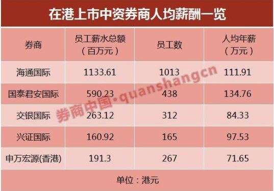据不完全统计,内地上市券商人均薪酬前3位的分别是:国金证券(71.37万元),海通证券(61.66万元),兴业证券(54.53万元),不过这些薪酬的单位是人民币。简单按照0.85左右的汇率折算在港上市中资券商对应的人民币平均薪酬分别是,国泰君安国际(114.54万)、海通国际(95.12万)、兴证国际(82.9万)、交银国际(71.68万)、申万宏源(香港)(60.9万)。