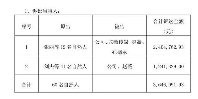 上述判决书显示,张丽等19名自然人及刘杰等41名自然人要求,判令祥源文化、龙薇传媒、赵薇、孔德永赔偿原告的经济损失合计约364.61万元,同时被告承担案件的诉讼费用。