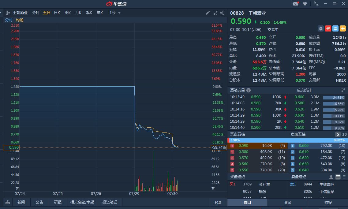 智通财经APP获悉,王朝酒业(00828)停牌超6年,昨日复牌收跌52.08%,今日早盘跌势延续,一度低见0.57港元破底。截至10时16分,跌14.49%,报价0.59港元,成交额756.2万。