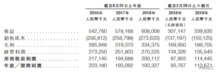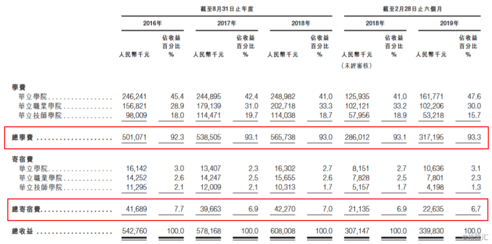 营业纪录期间,华立大学的全部收益均来自学费及寄宿费。截至2016年、2017年及2018年8月31日止年度与截至2018年及2019年2月28日止六个月,总收益分别为人民币5.43亿元、5.78亿元、6.08亿元、3.07亿元及3.40亿元。