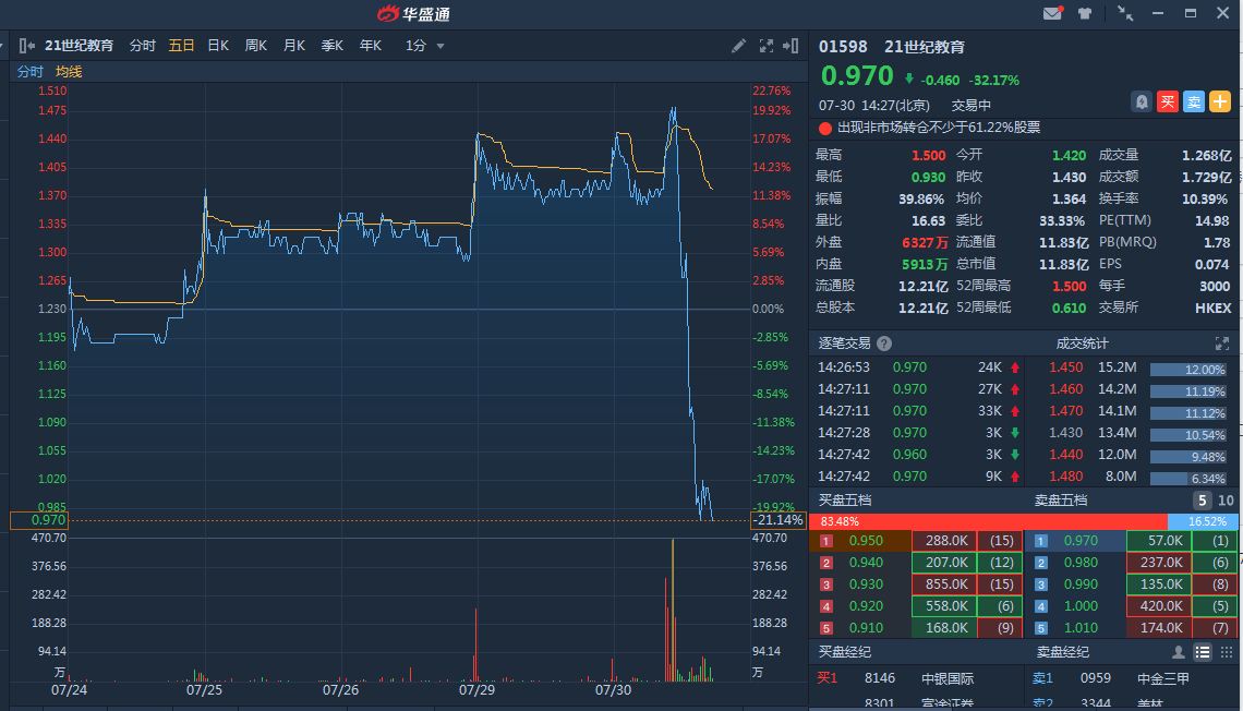 新浪港股讯 7月30日消息,21世纪教育获利回吐一度暴跌34%,截止发稿,跌32.17%,报0.97元。21世纪教育自7月15日开始发力由开市时的0.79港元,升至7月26日1.44港元高位,创逾1年高位,10个交易日累计升幅82.3%或0.65港元。