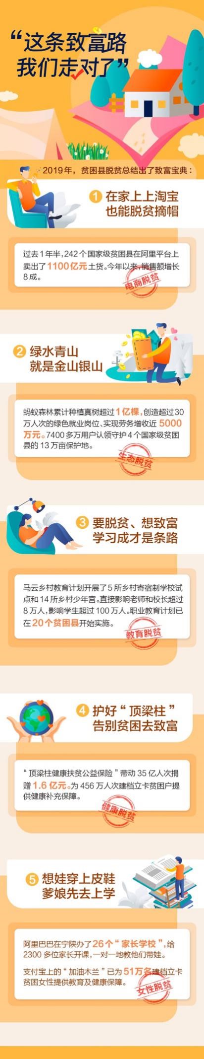 2017年12月,阿里巴巴宣布成立脱贫基金,投入百亿元在教育,健康,女性,生态,电商5大领域参与脱贫攻坚。在江西寻乌县,“613854”成为脱贫致富密码——一大批寻乌农特产品通过阿里平台销往全国各地,带动6100余贫困群众参与电商产业;马云乡村寄宿制学校,助力寻乌教育脱贫;“童伴妈妈”、“加油木兰”等公益项目,帮助当地女性发展。