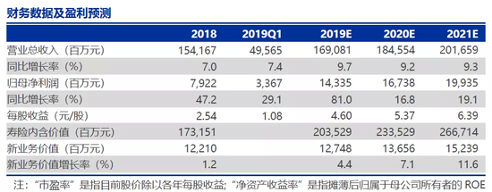投资建议:公司稳健经营、管理层逐步到位,叠加净利润增速提振,估值低位下催化剂已到位、修复可期。基于公司税费结转的影响上调公司盈利预测,预测2019-21年EPS分别为4.60/5.37/6.39元/股(原19-21年EPS为3.29、4.20和5.31元/股),当前对应19年PEV仅为0.84倍,维持买入评级。预计公司2019年上半年NBV同比增长约为2%,二季度公司将精力部分倾斜于新人增员,预计半年度代理人规模可达38万人,较去年底人力已恢复并有所改善。当前估值仍位于历史低位,把握下半年管理层到位后的事件催化与负债端平稳运行的业绩催化,维持“买入”评级。