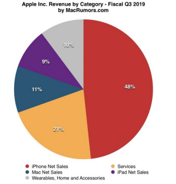 本季度iPhone的营收占比跌破了50%,这意味着目前苹果的业绩对于手机销售依赖度稍有降低,但占48.3%仍是第一大收入来源。