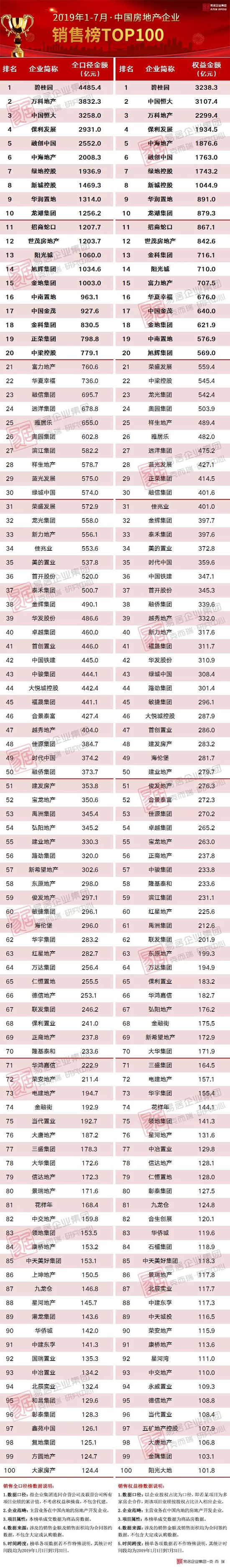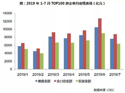 2019年以来,中国房地产市场保持稳定增长预期。1-7月,按照可比口径统计,TOP100规模房企的累计业绩同比增速在4%左右,行业整体规模增速较2018年放缓显著。7月,百强房企的单月业绩表现整体平稳,与上半年均值基本持平。单月操盘口径和权益口径的销售规模均较6月环比降低近29%,同比略高于去年同期。我们认为,2019年将是房地产市场销售“小年”的预期不变。三四季度随着企业供货的增加,百强房企的整体销售会有一定幅度的提升,但出现快速增长的概率不大。