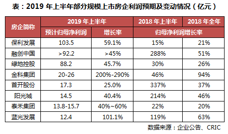 另外,截止目前已有不少规模上市房企陆续披露了2019年上半年的业绩预告。从企业利润表现来看,今年房企整体利润规模在上了一个台阶之后进入平稳期。规模房企的利润表现强者恒强,而中小规模房企未来利润增长仍将面临较大的压力。