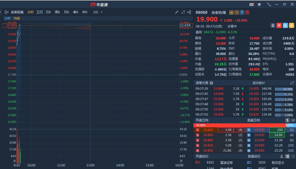 截至9时37分,涨12.43%,报价19.9港元,成交额4600万。