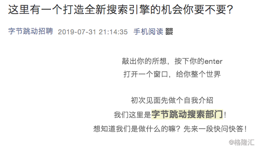 7月31日晚,字节跳动在其“字节跳动招聘”公众号上正式对外为“字节跳动搜索部门”招聘员工。