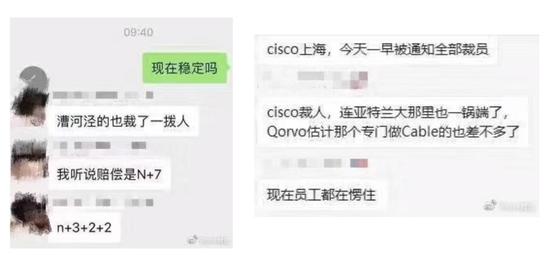 裁员事件在下午进一步发酵,更多消息出现在社交媒体中。有多张疑似思科裁员的爆料截图显示:思科位于漕河泾的上海分公司正在裁员,赔偿方案为 N+7,“人均 100 多万”。