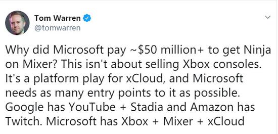 Tom Warren解释说,微软重金买下Ninja,并不是为了卖Xbox,而是为了自家的云游戏平台xCloud,微软需要尽可能多的入口点。谷歌现在有YouTube+Stadia,而亚马逊有Twitch,微软现在则是Xbox+Mixer+xCloud。