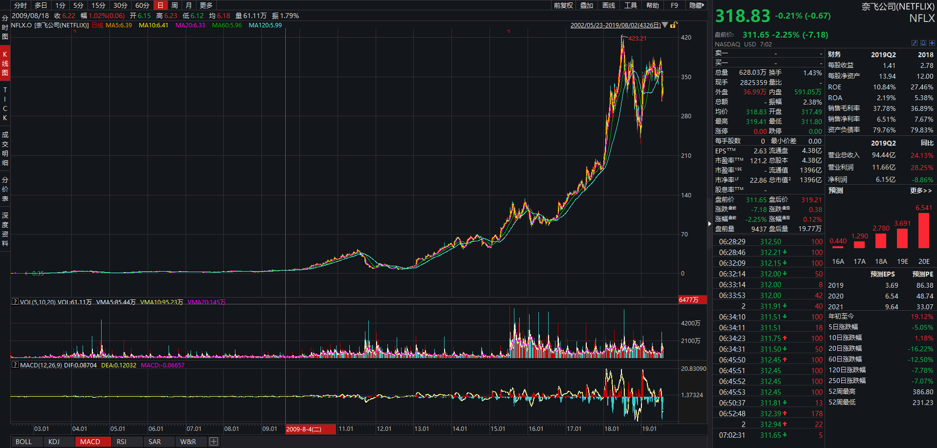 2019年公司的市盈率预计为98.08倍,估值较高,加上近一季度的用户增速下滑,市场又开始了对奈飞的质疑。
