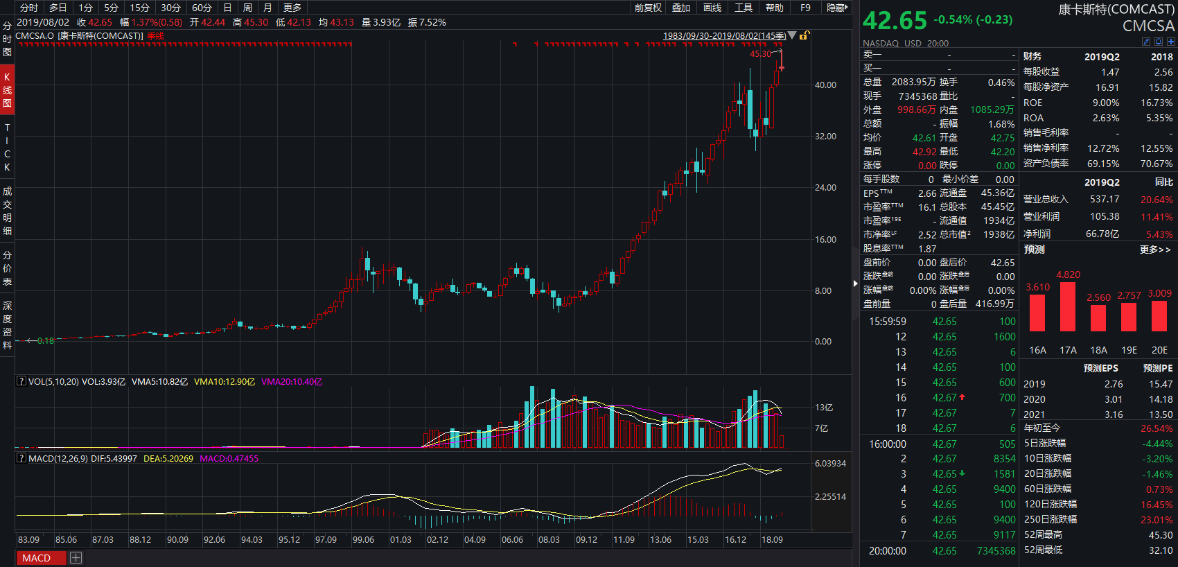 从2019年预期来看,康卡斯特的市盈率为14.26倍,AT&T市盈率9.57倍,Verizon市盈率为11.62倍,AT&T的价格相对估值最低。从涨幅来看,康卡斯特近10年以来涨了6倍,远超其他两位,是电信帝国名副其实的大牛股。