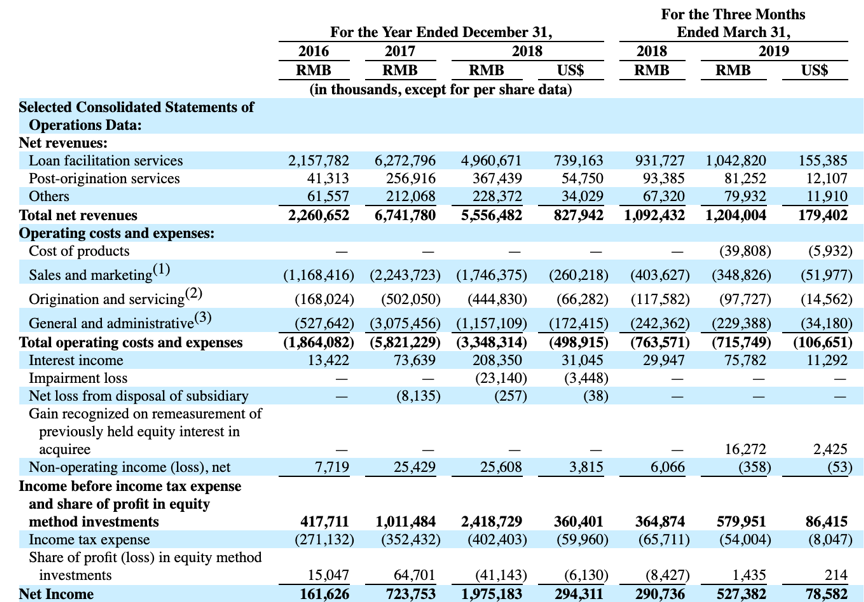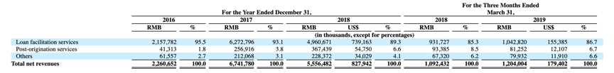 根据招股书,2018财年贷款便利服务收入达49.6亿元,占总收入89.3%;发起后服务收入达3.67亿元,占总收入6.6%;其他收入达2.28亿元,占总收入4.1%。此外,2019年前三个月玖富的总收入达到12亿元,同比增长10.2%,各收入分部比例变动不大。
