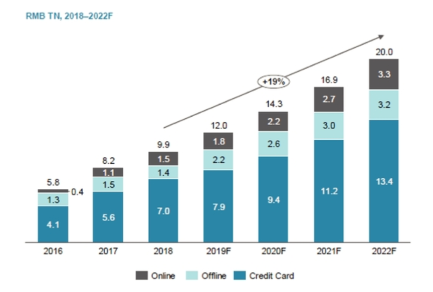 整体而言,玖富集团所处的在线金融消费市场成长前景更为广阔。据Oliver Wyman统计,2018年中国在线消费金融市场的未偿还余额为1.5万亿元,并预计在2022年达到3.3万亿元,年复合增长率22%;相比之下,个人消费金融市场到2022年将增长至20万亿元,年复合增长率仅为19%,整体增速不及在线消费金融市场。