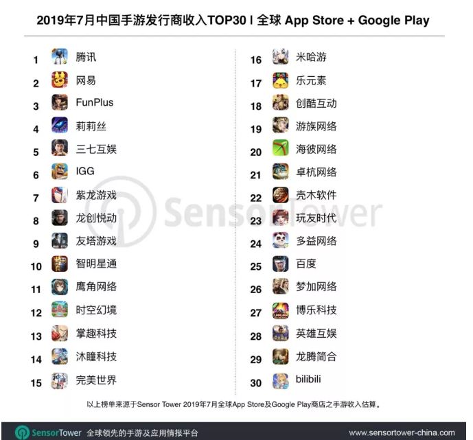 Sensor Tower商店情报平台显示,2019年7月中国手游发行商在全球App Store和Google Play的收入排名榜单中30个手游发行商7月全球吸金超过14.2亿美元,拿下当期全球手游总收入27%的市场份额,其中腾讯、网易、FunPlus、莉莉丝、三七互娱排名前五。(36氪)