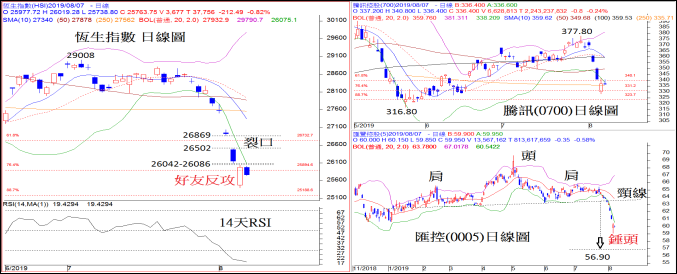 首先,恆指持續以裂口及大陰燭確切跌穿20天保力加通道下限線收市,令通道波幅顯著擴大,是單邊跌市的表現,難望於短時間內見底;
