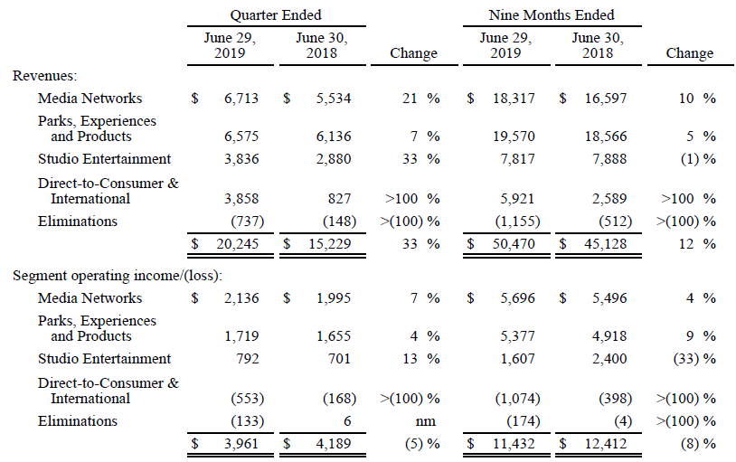 从利润方面,媒体网络与乐园业务贡献绝大部分运营利润,对应同比增速分别为7%及4%,《复仇者联盟4》、《惊奇队长》、《狮子王》、《玩具总动员4》及《阿拉丁》获得成功,票房大好提振影业,该分部运营利润增速高达13%,季度贡献7.92亿美元。复联4全球总票房达27.902亿美元,登上影史全球票房冠军,上月29日即宣布2019 年度全球票房已突破76. 7 亿美元,下半年将上映《冰雪奇缘2》、《沉睡魔咒2》及《星球大战9》等重磅影片。直接面向消费者和国际业务运营亏损大幅提升,主要与公司流媒体扩张有关,包括并入Hulu,加大ESPN+的投资等。