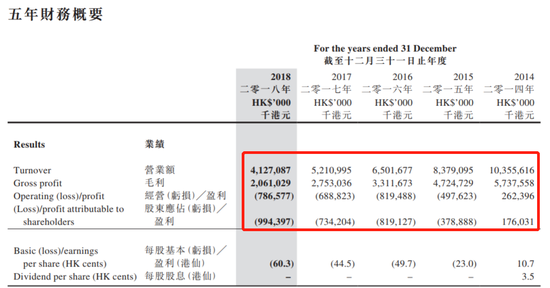 观察公司近5年业绩可以发现,公司营业额从2014年的103.5亿不断下滑,2018年只剩下41.27亿的营业额;公司毛利也从2014年的57亿下滑到2018年的20.61亿;2015年,公司净利从盈利转为亏损,2018年亏损则进一步扩大到近10亿。