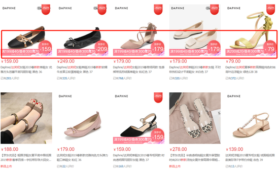 为了清理库存,“漂亮不打折,美丽100分”的达芙妮也开始了疯狂的打折。线下,买一送一,低至99元起成为达芙妮的常规操作,在拼多多、唯品会上出售尾货也成了必要的选择。记者发现,拼多多上达芙妮专卖店的鞋类产品从14元到62元不等。