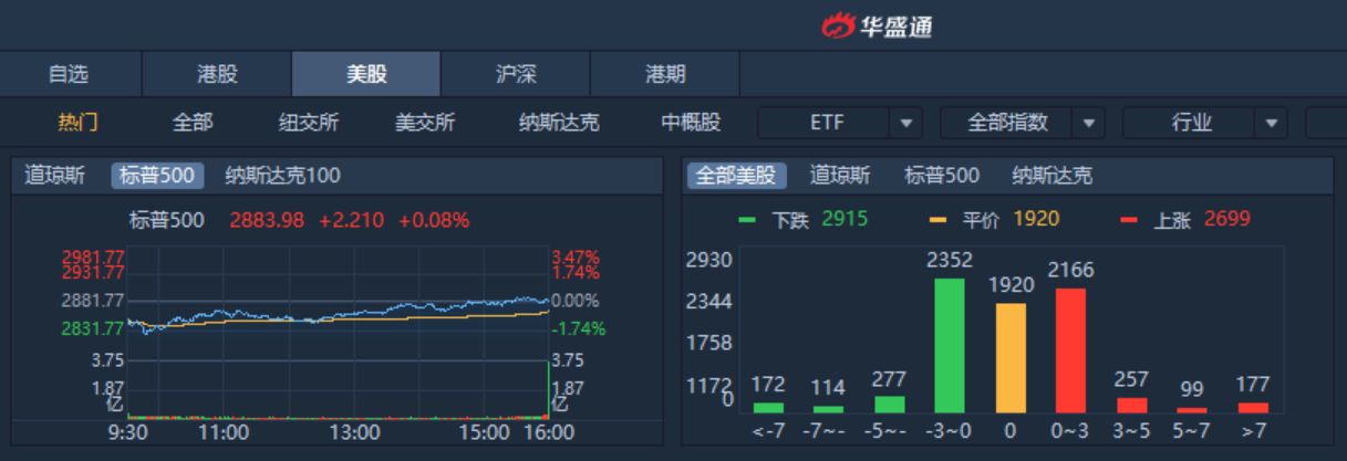 周三,美股大幅低开后强力反弹 标普纳指迎来两连涨。标普500涨0.08%,报2884.00点;道指跌0.08%,报26007.07点;纳指涨0.38%,报7862.83点。
