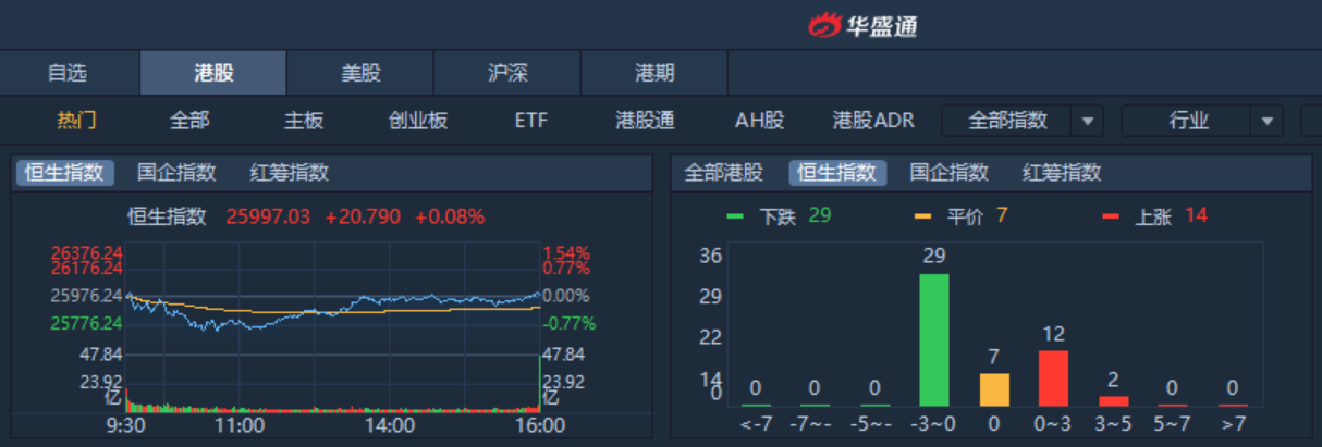 周三,恒指开盘微升0.01%,盘初曾一度下挫转跌,拉升后维持窄幅震荡。截至收盘,恒生指数涨20.79点或0.08%,报25997.03点,全日成交额达800.95亿。国企指数跌0.19%,报9993.34点,红筹指数涨0.38%,报4083.13点。