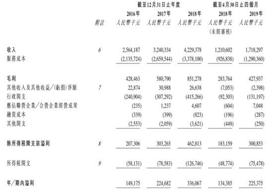 资料显示,公司物业管理费主要按包干制收取,有少量物业管理服务的收入按酬金制收取。员工成本居各项成本之首,且总体呈上升趋势。公司2016财年、2017财年及2018年财年收入分别为25.64亿元、32.40亿元及42.29亿元,同比增长分别为26.37%及30.52%。净利同比增长分别为50.62%及49.57%,毛利同比增长分别为35.55%及46.57%。