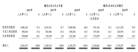 公司主营业务为物业管理服务、非业主增值服务及社区增值服务。收入方面,公司2016财年、2017财年及2018年财年物业管理服务收入分别占74.3%、74.7%及68.8%,总收入中绝大份额来自物业管理服务,非业主增值服务及社区增值服务对总收入贡献较小。而毛利率方面,社区增值服务所占份额远超物业管理服务及非业主增值服务。公司2016财年、2017财年及2018年财年社区增值服务毛利率分别占43.8%、46.2%及48.4%,社区增值服务主要包括社区生活服务及社区资产增值服务,如家政服务、停车场管理服务等,相较于其余两条业务线,社区增值服务毛利率较高,公司主营业务在收入和毛利率上呈现结构差异。