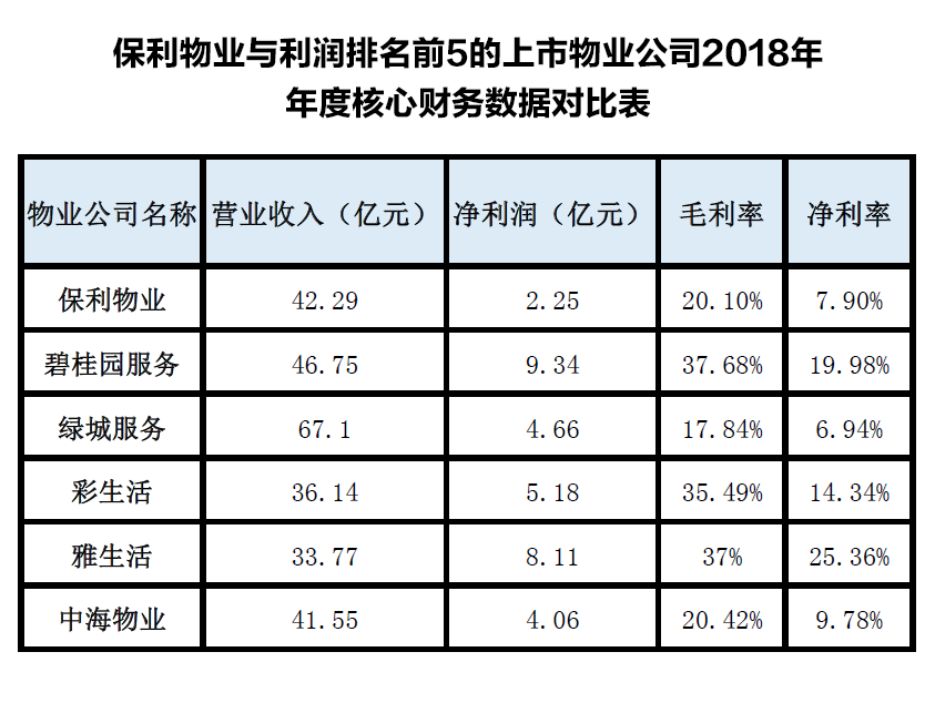 以2018年年末的营收规模来看,保利物业的营收规模在上市物业公司中仅次于绿城服务和碧桂园服务,后两者的营收规模分别为67.1亿元和46.75亿元。