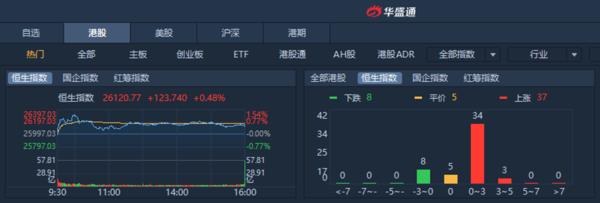 周四,恒指早盘微涨0.01%,盘初直线拉涨,一度涨至1.2%,随后全日震荡回落。截至收盘,恒生指数涨123.74点或0.48%,报26120.77点,全日成交额达759.61亿。国企指数涨0.48%,报10041.62点,红筹指数涨0.83%,报4117.06点。