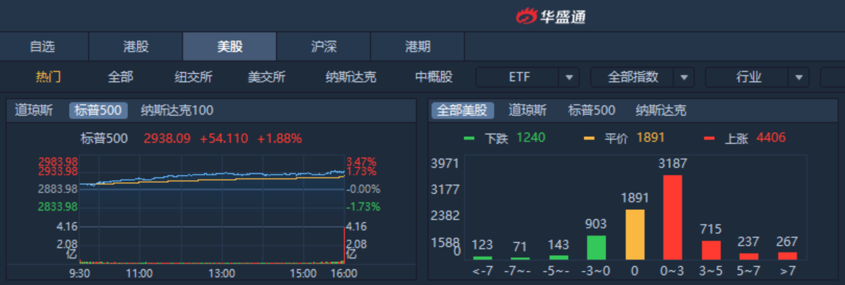 周四,强劲数据及外汇市场趋稳支撑,三大股指均收高。道指涨1.43%,报26378.19点;标普500涨1.88%,报2938.09点;纳指涨2.24%,报8039.16点。