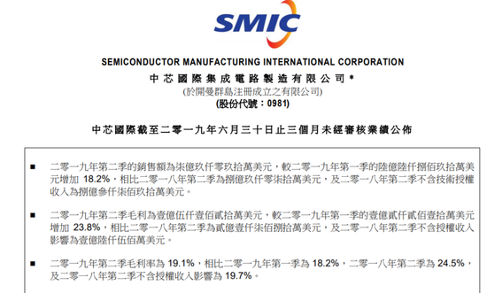 中芯国际(00981.HK)2019年第二季度本公司拥有人应占利润为1853.9万美元,市场预期为3968万美元,去年同期为5159.9万美元,同比下降64%。