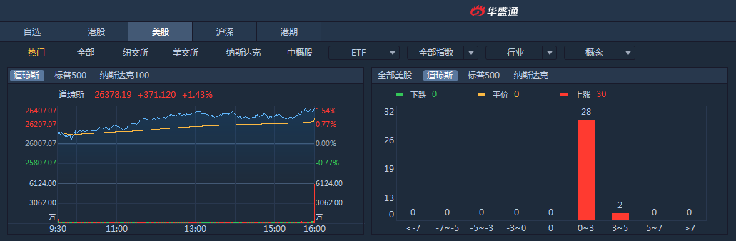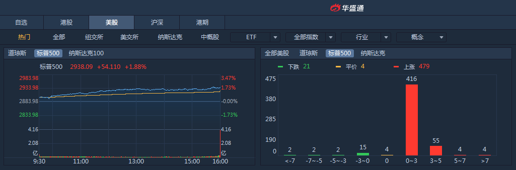 周四,强劲数据及外汇市场趋稳支撑,三大股指均收高。道指涨1.43%,报26378.19点;标普500涨1.88%,报2938.09点;纳指涨2.24%,报8039.16点。