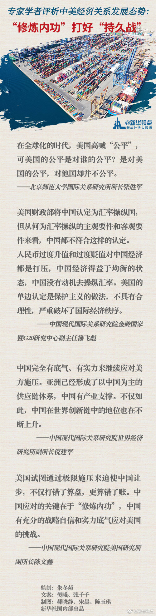 【专家学者评析中美经贸关系发展态势:“修炼内功”打好“持久战”】近日,美方宣称拟对3000亿美元中国输美商品加征10%关税,并给中国扣上“汇率操纵国”的帽子。在中国现代国际关系研究院9日举行的“中美关系发展趋势评估研讨会”上,专家学者们表示,中美贸易摩擦将常态化存在。对于中国来说,关键在于“修炼内功”,专心做好自己的事,科学认识,沉着应对。