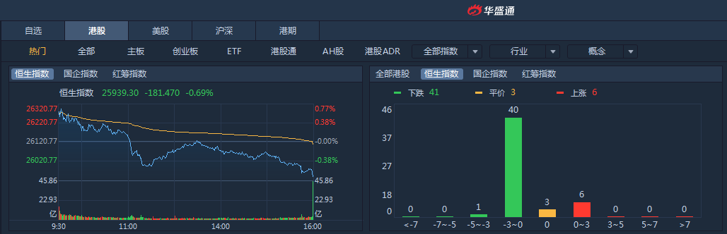 周五,恒指早盘涨0.61%报26278点,开盘后大市持续震荡下行并失守26000点关口。截至收盘,恒生指数跌0.69%,报25939.3点,全日成交额685.3亿;国企指数跌0.48%,报9993.84点;红筹指数跌0.19%,报4109.42点。