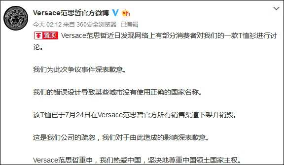 此后,范思哲官方微博也发布了声明,称是因为“我们的错误设计导致某些城市没有使用正确的国家名称。”涉事T恤已于7月24日在Versace范思哲官方所有销售渠道下架并销毁。