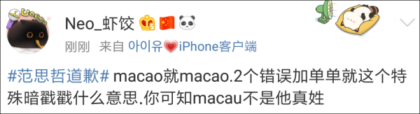 近期有多张网传图片显示,在范思哲的服装上,同为中国城市的北京、上海对应的是China(中国),但香港和澳门对应的却是Hongkong(香港)、Macao(澳门)。