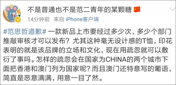 原标题:T恤将香港、澳门列为国家?范思哲道歉:已下架并销毁