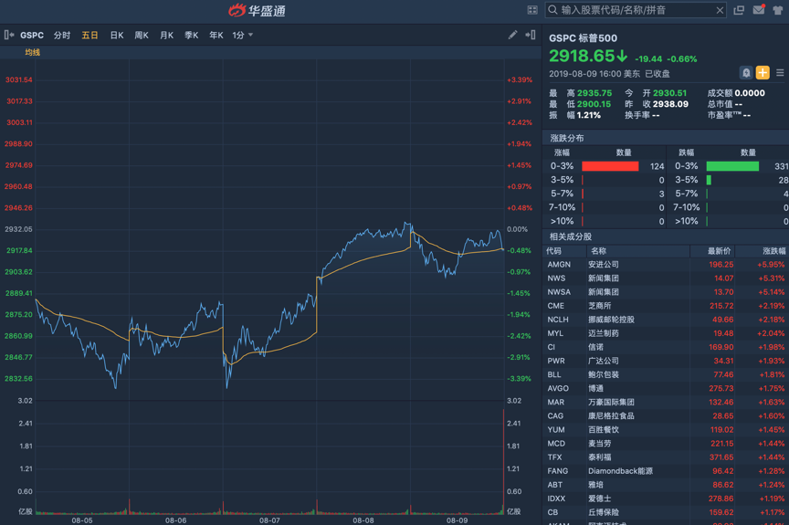 受贸易紧张情绪打压,美股三大股指以集体收跌结束动荡的一周,标普500在周一大跌超3%后逐步回升。截至周五收盘,道指较之前一周收盘点位下跌0.34%,报26287.44点;标普500指数下跌0.66%,收报2918.65点;纳指下跌一1%,收报7959.14点。