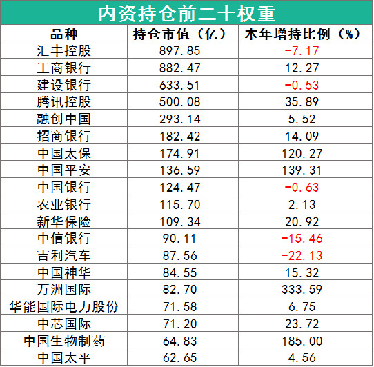 这是内资目前持有市值最高的前20个企业,从上表我们可以看出行业上基本集中在银行保险两个板块,这两个板块加起来占了11个,其中前三位全是银行股。