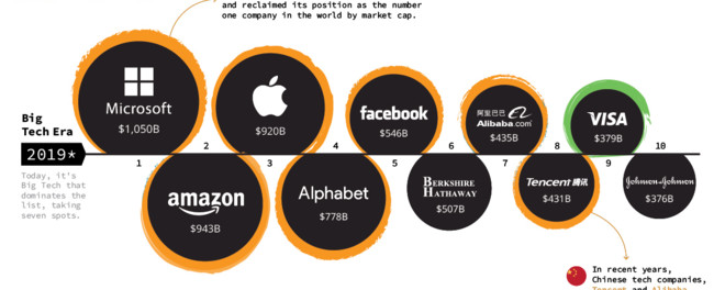 而再下面这张图就更有白云苍狗、斗转星移、沧海巫山的戏码。这张图反映从1999年到2019年这二十年全球市值top 10排行榜的变迁。1999年的互联网泡沫时期,当年的科技领袖微软、思科、英特尔、诺基亚都见到估值大顶。彼时大家都是对互联网对IT通讯不切实际的幻象与意淫,而其中诺基亚算是早夭,令人唏嘘。