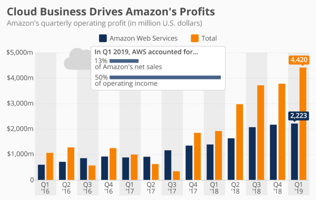 但亚马逊近几年的利润主要是由其云业务推动的。在过去一个季度尽管AWS净销售额仅占公司的13%,但该业务的营业利润占公司总营业利润的50%以上。