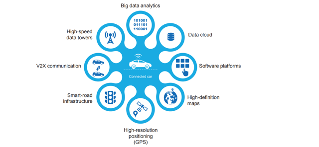汽车的未来不仅取决于机器人技术和人工智能,还取决于汽车与周围环境的联系。车辆与所有设备之间的通信是一种技术形式,允许车辆与运输系统的移动部件进行连接。这种连接由几个部分组成,车对车、车对路、车对基础设施、车对网和车对人。这些连接会生成大量数据,仅一辆车一天就会产生4000 GB的数据。
