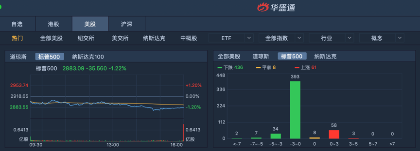 周一,美债收益率引发经济衰退担忧,美股三大股指加速下跌后再度收低。其中道指跌1.49%,报25896.44点;标普500跌1.23%,报2882.69点;纳指跌1.2%,报7863.41点。